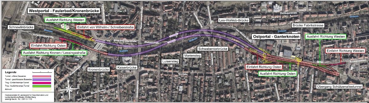Der längste Abschnitt zwischen den beiden Ein- und Ausfahrtsportalen wird in „geschlossener“ Bauweise (lila eingefärbt) gegraben. Hier bohrt sich eine Tunnelvortriebsmaschine durch das Erdreich, ohne die Oberfläche zu berühren oder weitere Baugruben auf der Strecke des Tunnels nötig zu machen. An der Oberfläche ist in diesem Abschnitt nichts zu sehen.