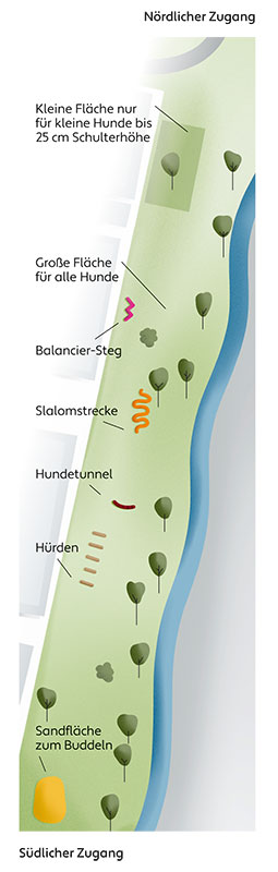 - Im eingezäunten Bereich dürfen sozialverträgliche Hunde ohne Leine laufen, vorausgesetzt sie sind auch ohne Leine durch die Begleitperson kontrollier- und abrufbar. Bitte beachten Sie, dass die große Hundewiese auf der Ostseite nicht eingezäunt ist, sondern durch eine Brombeer-Böschung und einen Bach begrenzt wird. Kleine Hunde könnten zudem den Abstand zwischen Zaun und Boden zum Durchschlüpfen nutzen. Die Benutzung erfolgt auf eigene Verantwortung.