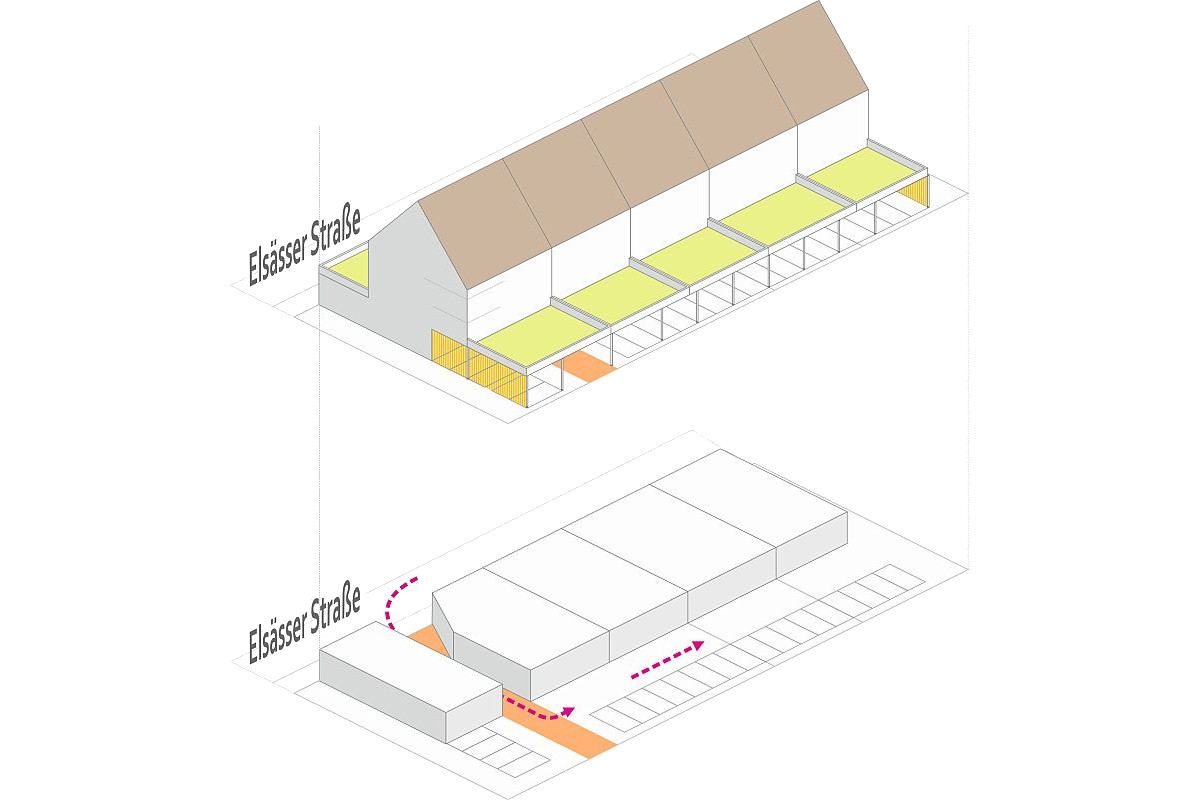 Auf Basis der 2021 geführten Gespräche des IEMs mit den Eigentümer_innen der privaten Grundstücke entlang der Elsässer Straße zwischen Falkenberger Straße und Hutweg wurde deutlich, dass sie sich keine zeitlich zusammenhängende Neuentwicklung vorstellen können. Dadurch wurde eine gemeinsame Tiefgarage, wie der städtebauliche Entwurf des Rahmenkonzepts vorgeschlagen hatte, faktisch unmöglich. Unter anderem diese Rahmenbedingung hat dazu geführt, dass das IEM für diese Grundstücke den städtebaulichen Entwurf des Rahmenkonzepts zu einem „modularen Konzept“ weiterentwickelt hat.