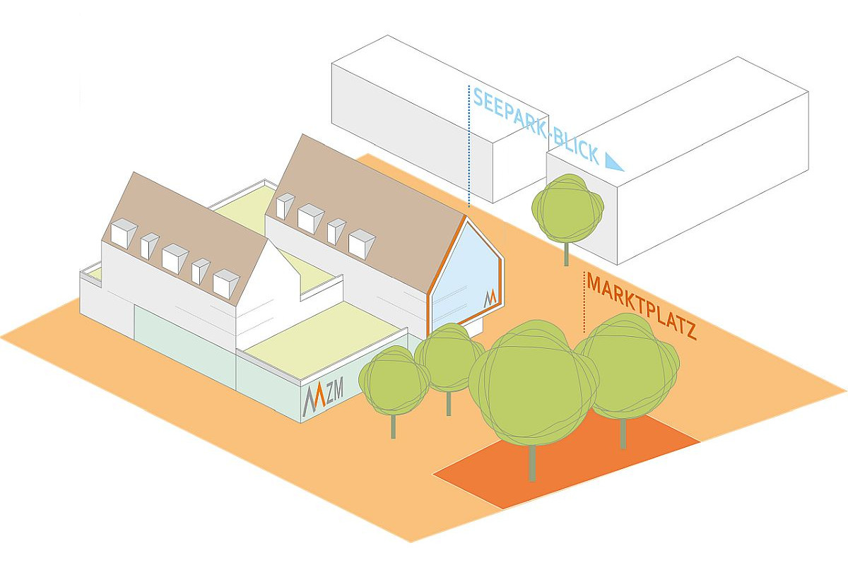 Auch den städtebaulichen Entwurf für das städtische Erbbaugrundstück an der Ecke Falkenberger Straße / Elsässer Straße wurde 2021 vom IEM weiterentwickelt. Der Stadtteiltreff wurde zu einem „Multifunktionalem Zentrum Mooswald“ und um einen Lebensmittelmarkt und Wohnungen im bezahlbaren Segment ergänzt. Der Marktplatz des städtebaulichen Entwurfs - der zum Teil auf privaten Grundstücken vorgesehen wurde - wurde auf die andere Straßenseite verlegt. Er bildet dadurch den Auftakt in den Seepark. Auch hier führten neue Rahmenbedingungen und Rückmeldungen der betroffenen Eigentümer_innen zu diesem angepassten Vorgehen.