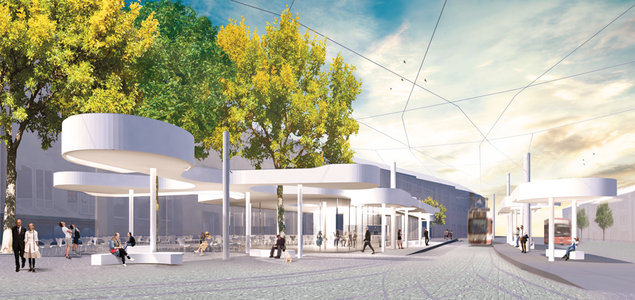 Ein Highlight der neuen Platzgestaltung stellt das spektakuläre Gebäudeensemble im Bereich der Haltestelle dar. Die Freiburger Stadtbau GmbH (FSB) errichtete an dieser Stelle einen Pavillon im Freiburger Effizienzhaus- Standard 70 mit Technik- und Betriebsräumen für die Freiburger Verkehrs AG sowie einer gastronomischen Einheit.