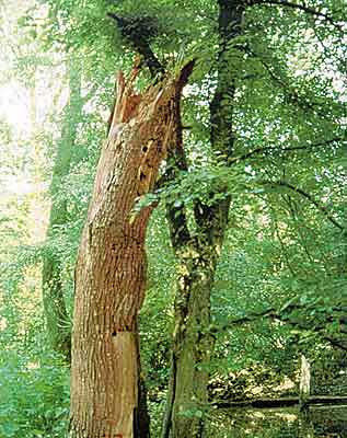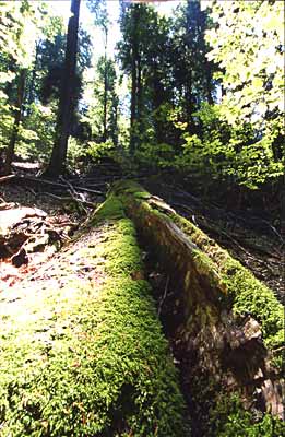 Anders als im Urwald werden Bäume im Wirtschaftswald lange vor ihrem natürlichen Tod geerntet. Die biologische Zersetzung abgestorbener Bäume ist daher selten geworden.