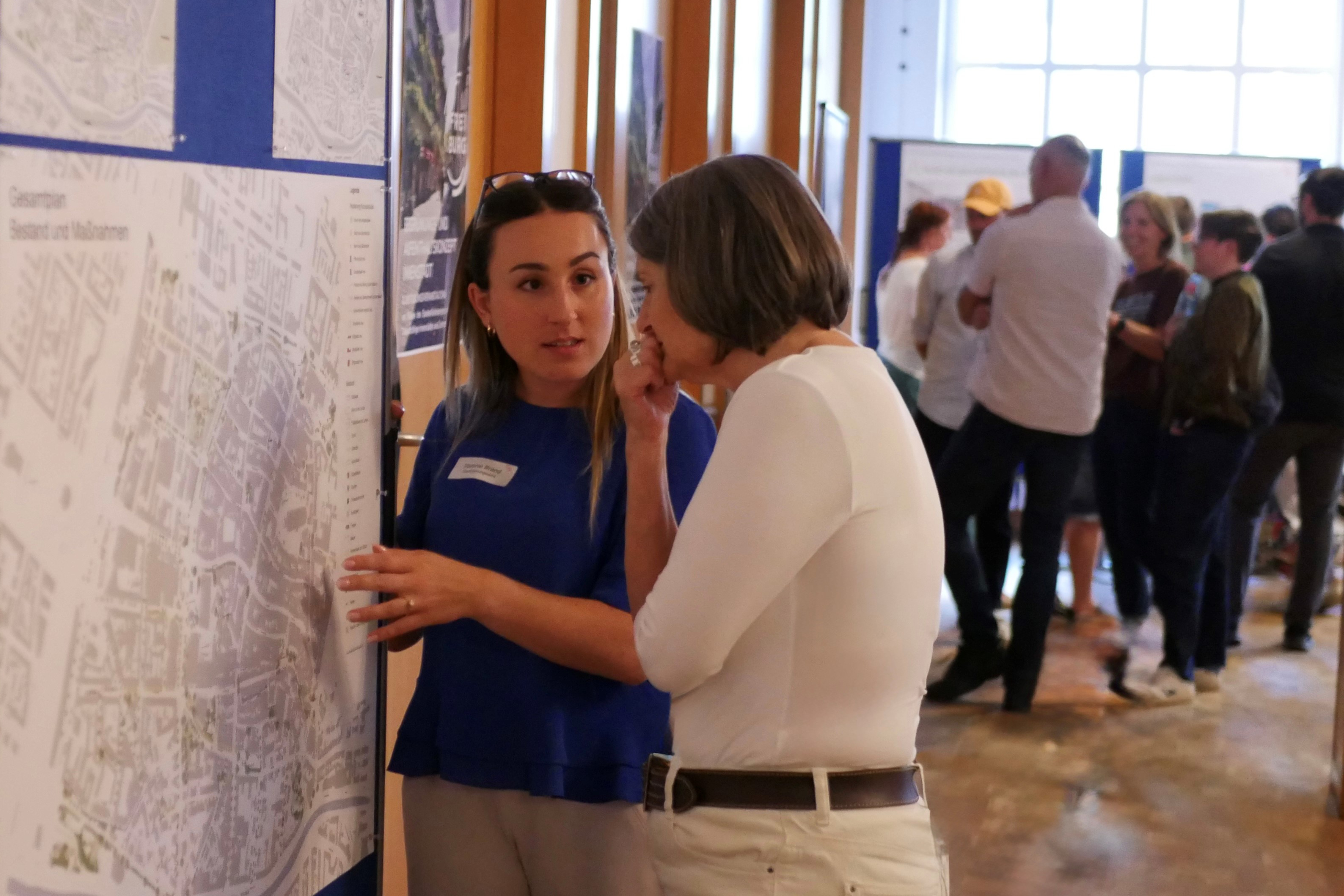 Zwei Personen in der Unterhaltung an einem Plakat