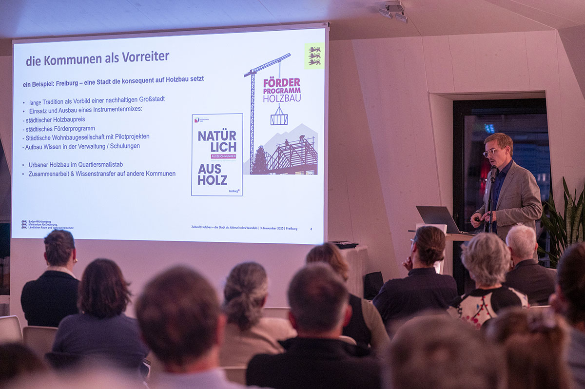 Mit der Abschlussveranstaltung „Zukunft Holzbau – die Stadt als Akteurin des Wandels“ setzte die Stadt Freiburg im November 2025 einen erfolgreichen Schlusspunkt unter das Projekt „Urbaner Holzbau im Quartiersmaßstab – Möglichkeiten der Verwaltung“. Im gut besuchten Freiburger Humboldtsaal kamen Fachleute aus Verwaltung, Forschung und Praxis zusammen, um aktuelle Entwicklungen, Projektergebnisse und Perspektiven des urbanen Holzbaus zu diskutieren.