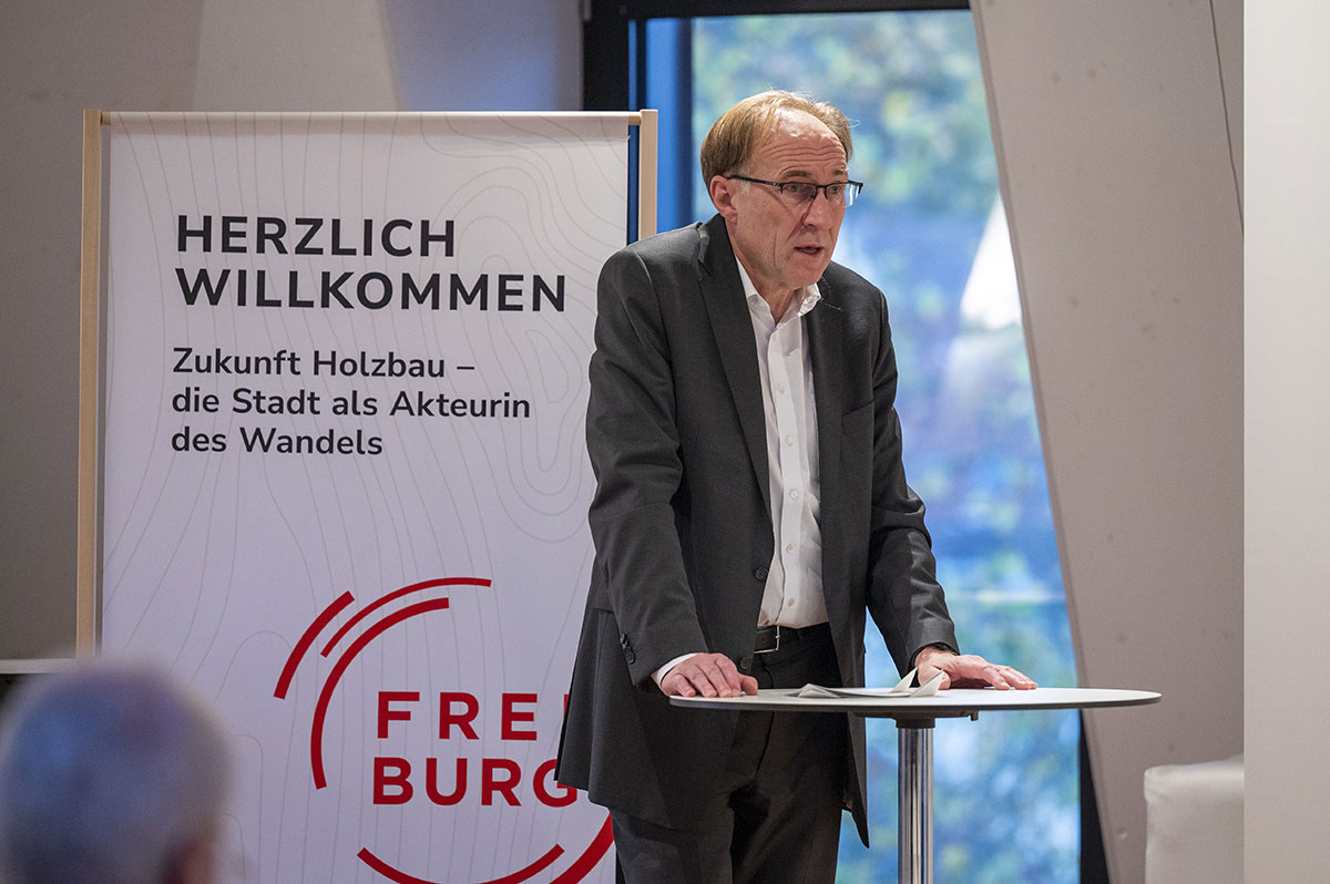 Nach der Begrüßung durch Freiburgs Baubürgermeister Prof. Dr. Martin Haag, der Freiburgs bisherige Aktivitäten im Holzbau und die ambitionierten Ziele der Stadt in einer nachhaltigen Stadtentwicklung aufzeigte, eröffnete Simon Treml vom Institut für Computerbasiertes Entwerfen und Baufertigung der Universität Stuttgart den Vortragsabend mit einem Beitrag zu „Innovationen im Holzbau – Potenziale und Strategien für eine ressourceneffiziente Baukultur“. Im Fokus standen neue Konstruktionsmethoden, digitale Planungsansätze sowie materialeffiziente Bauweisen, die den Holzbau als zukunftsfähige Alternative im urbanen Kontext stärken.