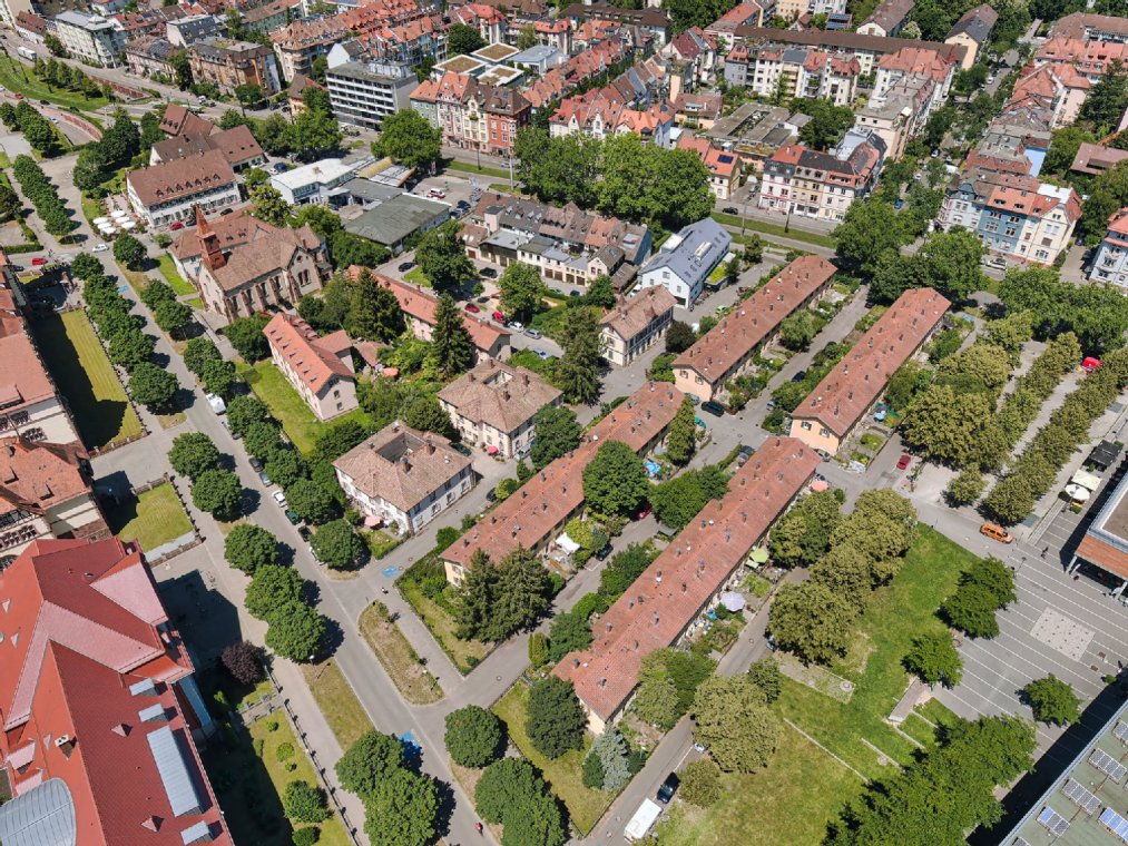 Abgrenzung Sanierungsgebiet Knopfhäusle-Siedlung Luftbild, Foto: Jan Raiber Luftbild, Foto: Jan Raiber Gemarkungsatlas Knopfhäusle, 1900 Reihenhaus Knopfhäusle-Siedlung