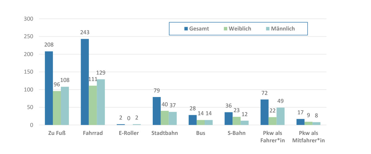 • Mobilitätsverhalten: Fast alle Teilnehmenden (94 %) gaben an, zu Fuß oder mit dem Fahrrad in der Stadt unterwegs zu sein. Jede*r dritte Teilnehmende nutzt den ÖPNV und jede*r vierte einen Pkw als Fahrer*in.