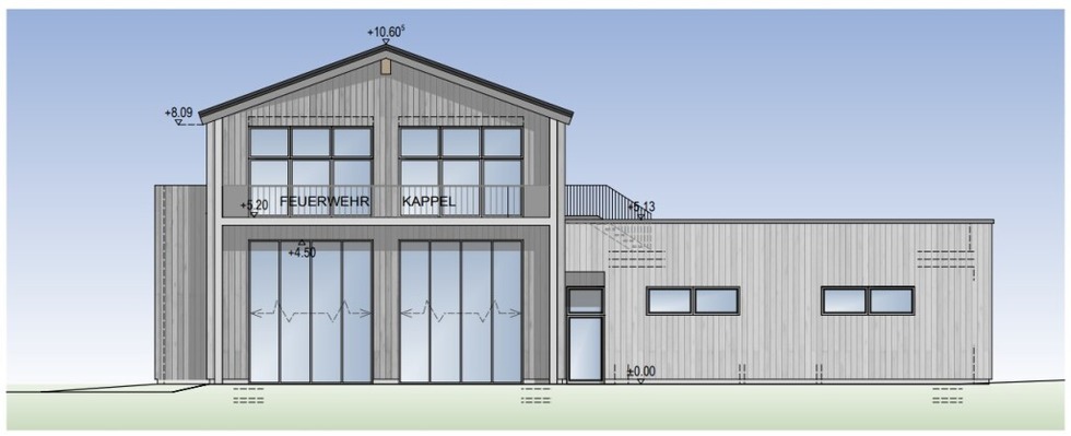 Neubau Feuerwehrhaus Kappel Die Pläne liegen vor. Dem Bauantrag wurde vom Ortschaftsrat Kappel am 23.02.2026 in öffentlicher Sitzung zugestimmt. Die letzte Entscheidung liegt nun am 03.03.2026 beim Gemeinderat Freiburg. Vorgesehen ist ein zweistöckiges Hauptgebäude mit der Fahrzeughalle und einem Lagerraum im Erdgeschoss. Im Obergeschoss befinden sich Mehrzweckraum, Küche, Büro sowie ein Bereich für die Jugendfeuerwehr. Im eingeschossigen Anbau sind Umkleide und Sanitärräume vorgesehen. Die Fassade ist aus Beton und im Obergeschoss aus Holz. Weil sich das Gebäude im potentiellen Starkregenbereich befindet, soll es in leicht erhöhter Lage errichtet werden. Das Dach wird begrünt und mit Solarmodulen bestückt.