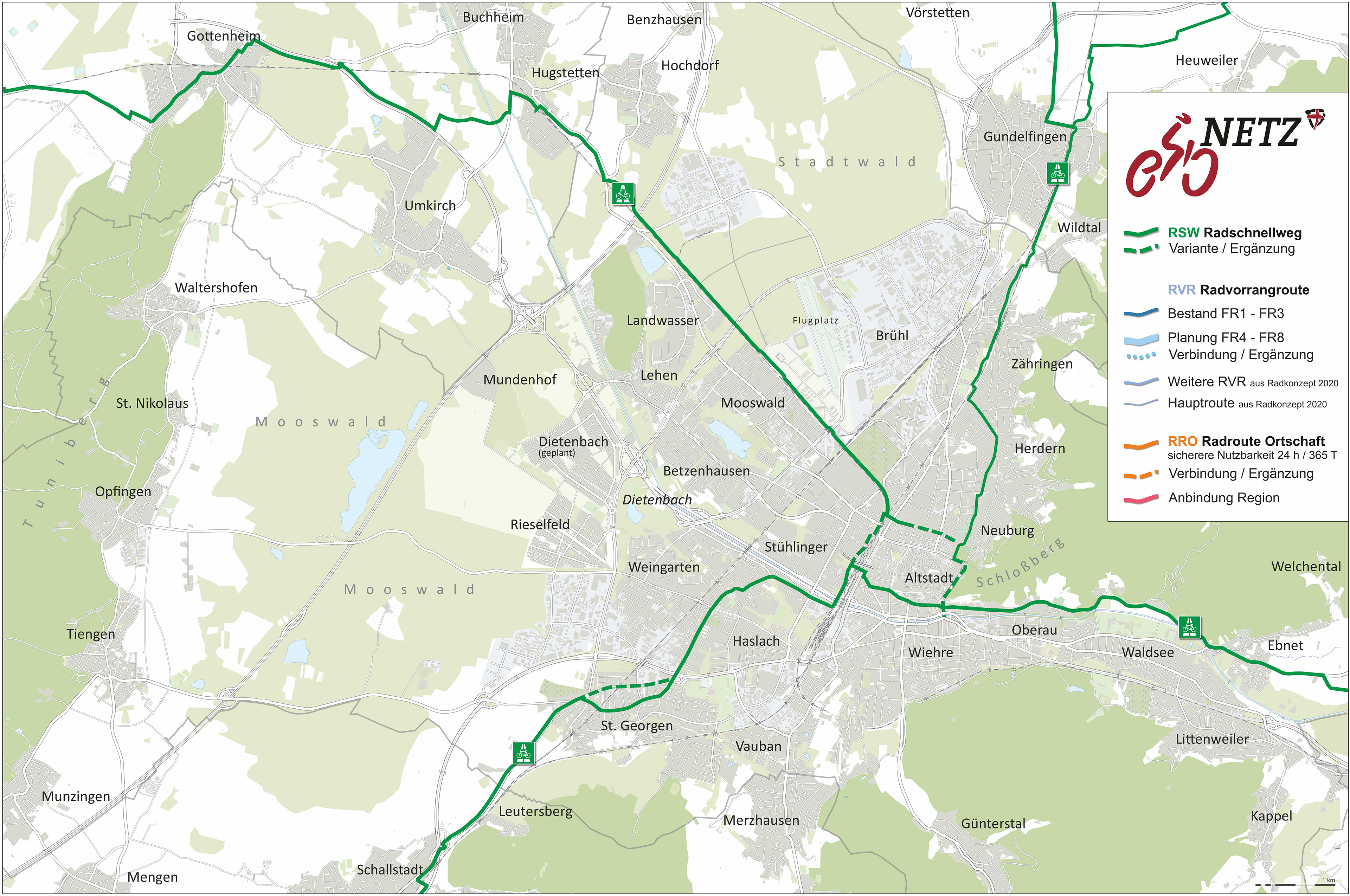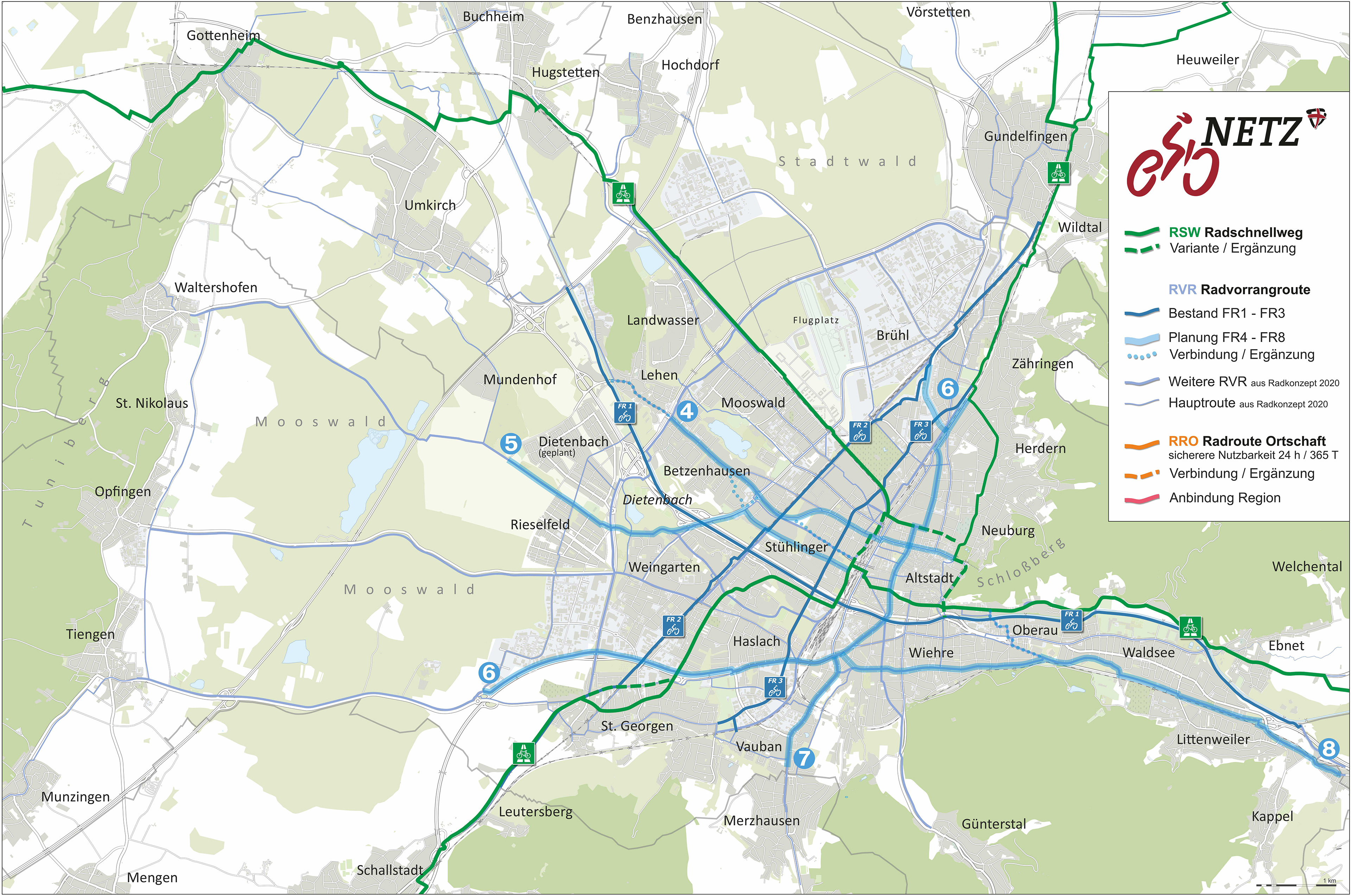 Die vom Gemeinderat 2012 mit dem Radkonzept beschlossenen drei Pilotrouten FR1 bis FR3 (dunkelblau) wurden bereits in weiten Teilen ausgebaut. Die Kennzeichnung des FR3 wird in absehbarer Zeit beginnen. Die Umsetzung der restlichen Maßnahmen auf diesen drei Routen wird weiter angestrebt.