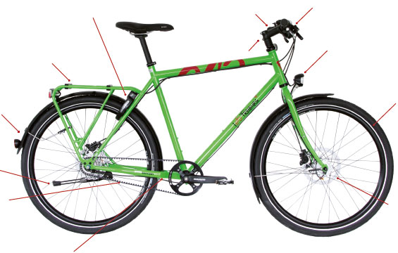 Nabendynamo und wartungsarme LEDs vorne und hinten mit Standlichtfunktion sind hell, wartungsfrei und sicher. Und: Gutes Licht ist Pflicht – auch auf den beleuchteten Freiburger Radwegen.