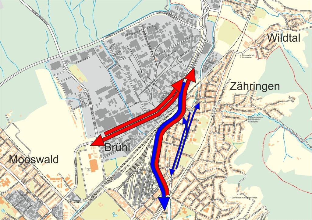 Die Vorzugsvariante setzt sich aus dem Ausbau der B 3 und der direkten Verknüpfung der B 3 mit dem Industriegebiet Nord und den westlichen Stadtteilen zusammen. Neben dem Ziel der Entlastung Zähringens vom Durchgangsverkehr kann durch die Kombination des in der Leistungsfähigkeit eingeschränkten Ausbaus der B 3 als Ortsumgehung Zähringen und des Vollanschlusses des Industriegebiets Nord zusätzlich das städtische Ziel zur Schaffung einer attraktiven Verkehrsachse von Norden in die westlichen Stadtteile vollumfänglich erreicht werden. Die Maßnahme wird in zwei Bauabschnitte geteilt.