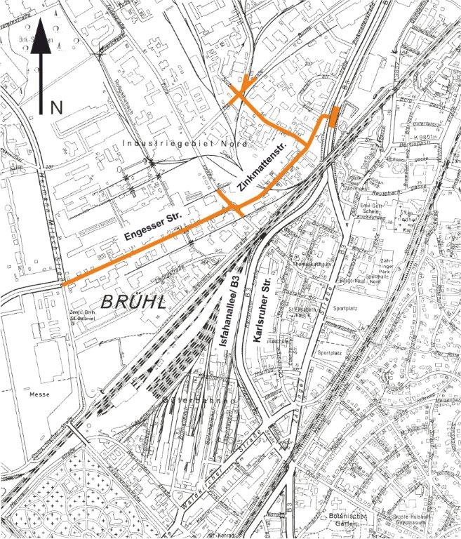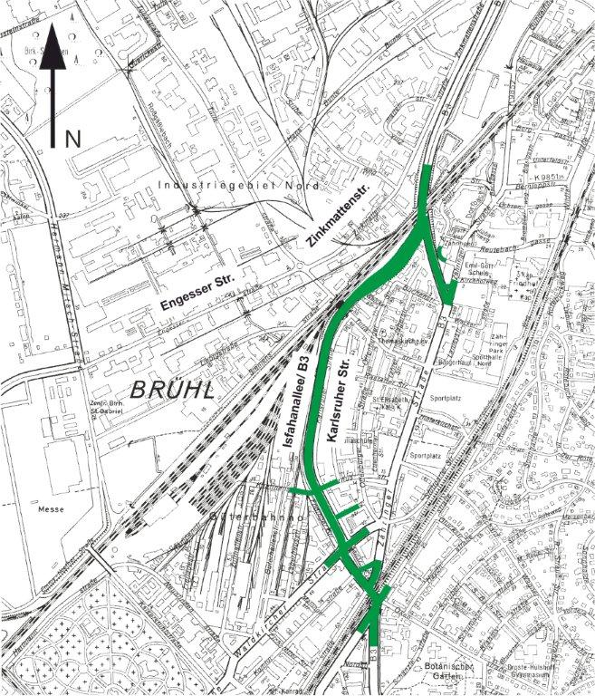 Die im Verkehrsentwicklungsplan 2020 enthaltene Variante eines vierstreifigen Ausbaus der B 3 zeigte in der Konkretisierung die Notwendigkeit von kostspieligen Neubauten der Brücke über die Tullastraße und des Bahnstellwerks. Daher hat die Stadtverwaltung ausgehend von der oben genannten Zielsetzung grundlegend verschiedene Ausbauvarianten untersucht und bewertet . Die beste Zielerreichung und das beste Nutzen-Kosten-Verhältnis kann mit der Variante "B 3 dreistreifig mit Anschluss Zinkmattenstraße" erreicht werden. Diese wurde vom Gemeinderat am 14.5.2013 gebilligt. Sie sieht den B 3 Ausbau mit zwei Fahrstreifen stadtauswärts und einem Fahrstreifen stadteinwärts sowie der Anbindung des Industriegebiets Nord durch einen Vollanschluss der Zinkmattenstraße vor.