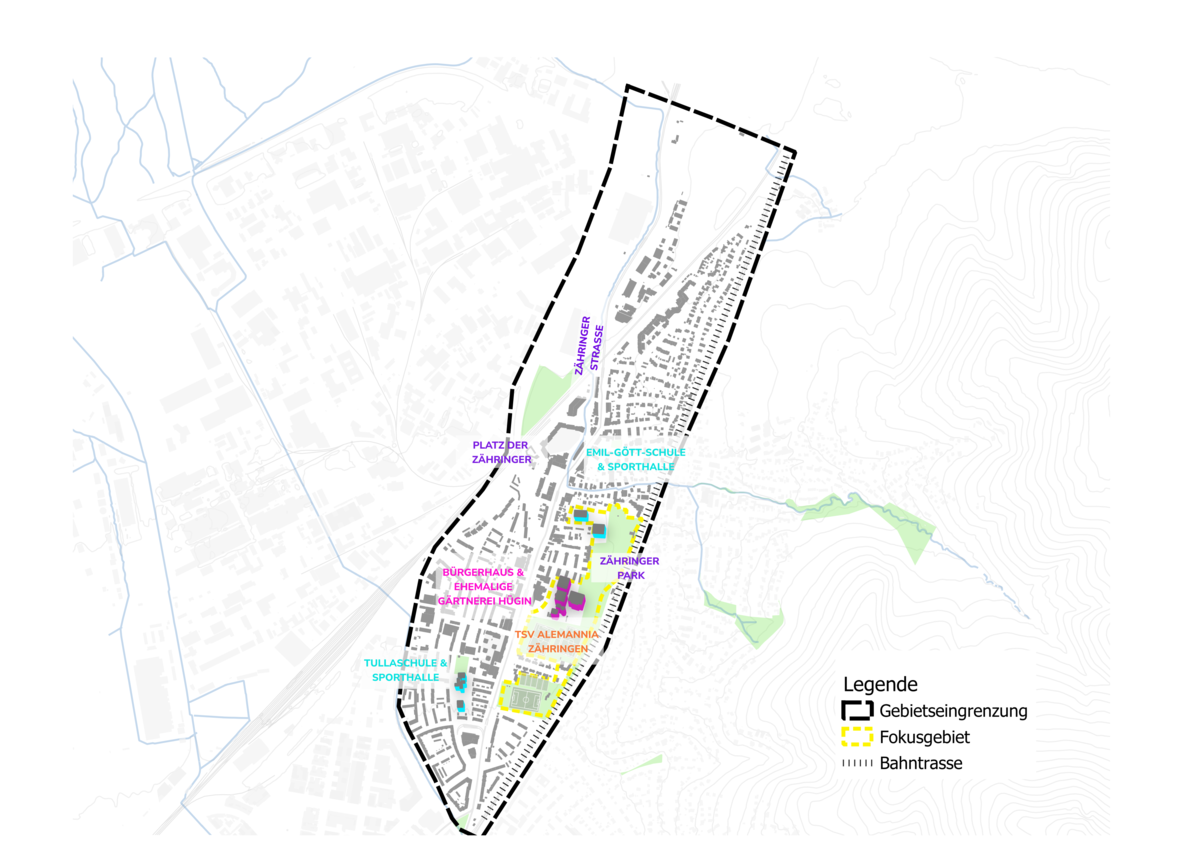 Die Fläche, die besonders viel Potenzial zur Innenentwicklung bietet, wird hier als Fokusgebiet beschrieben. Die Fläche befindet sich zentral im Rahmenplangebiet in der Lameystraße, westlich der Gleise der Rheintalbahn. Darin finden sich der Friedhof Zähringen, der Zähringer Park, das ehemalige Thermalbad, das Bürgerhaus und die Jahnhalle, die ehemalige Gärtnerei Hügin sowie die Flächen des Sportvereins. Der Großteil der Flächen sind derzeit einerseits mit öffentlicher Nutzung versehen, wie der Friedhof, wie Sportflächen des lokalen Sportvereins oder Freiflächen wie der Zähringer Park. Andererseits kann die Fläche als öffentlicher Raum betrachtet werden. Dieser nimmt sehr wichtige Funktionen innerhalb des Stadtviertels ein. Hier treffen Menschen aufeinander und stehen im Austausch. Im öffentlichen Raum machen die Leute Sport, hier gehen sie spazieren, hier wird sich ausgeruht oder gespielt - oder einfach nur ungestört „abgehangen“.
