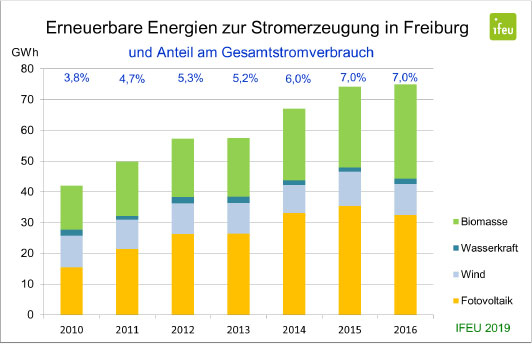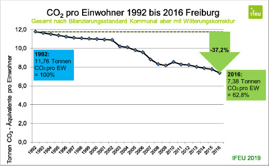 Die Freiburger CO2-Emissionen lagen im Jahr 2016 bei 7,38 Tonnen pro Kopf und damit 37,2 Prozent niedriger als 1992. Die Pro-Kopf-CO2-Emissionen in Freiburg sind in den letzten Jahren, seit 2009, zunächst fast gleich geblieben und erst ab 2013 wieder gesunken.