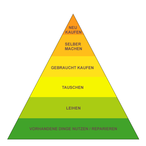 Die Konsumpyramide hilft dabei, sich für eine möglichst nachhaltige Handlungsoption zu entscheiden. Dafür wird sie unten und im grünen Bereich beginnend gelesen. Im roten Bereich in der Spitze ist als letzte Alternative der Neukauf zu finden.