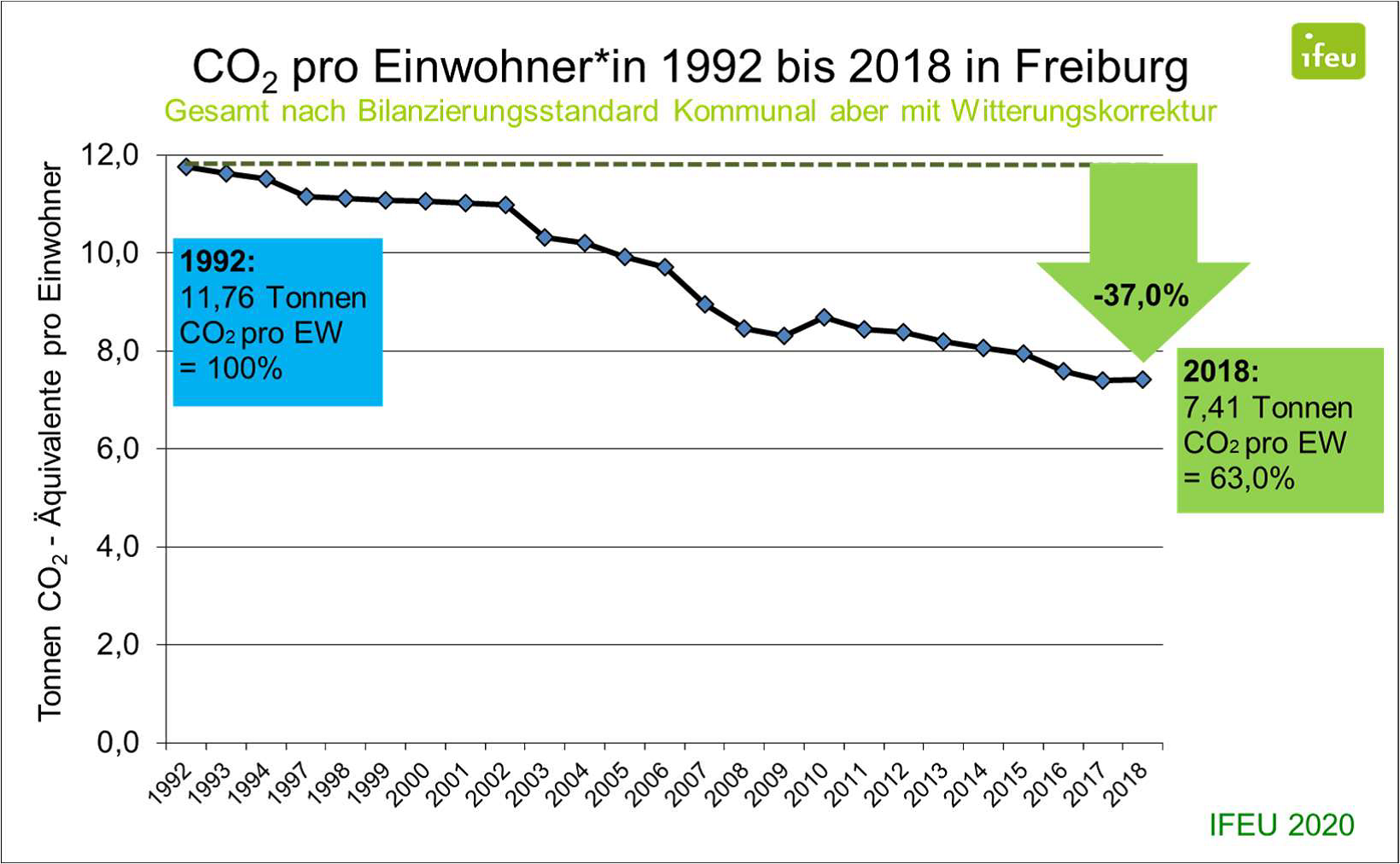 Die Freiburger CO2-Emissionen lagen im Jahr 2018 bei 7,41 Tonnen pro Kopf und damit 37 Prozent niedriger als 1992. Die Pro-Kopf-CO2-Emissionen in Freiburg (siehe Abbildung 1) sind in den letzten Jahren linear gesunken.Gegenüber der letzten Klimabilanz für die Jahre 2015 und 2016 ergibt sich eine Verbesserung um 1,4 Prozent.