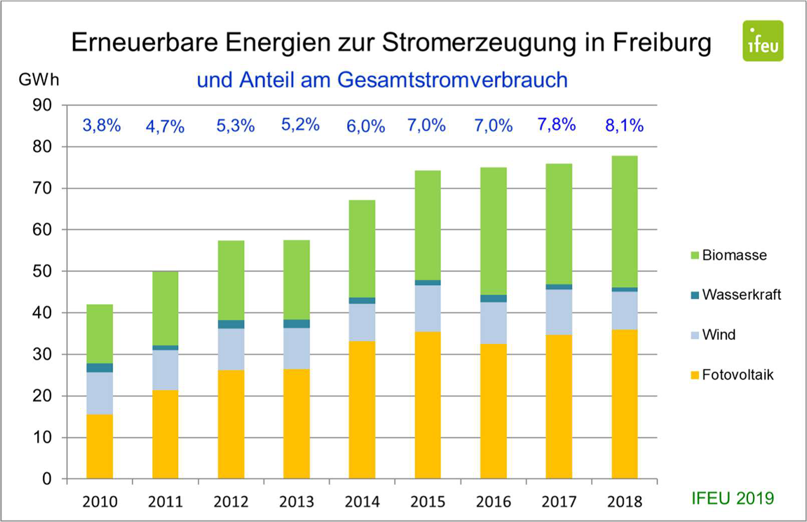 Freiburg gehört zu denjenigen Städten, deren Bevölkerung in den letzten Jahren stetig gewachsen ist. Im Vergleich zu 1992 wohnten 2018 rund 17 Prozent mehr Menschen in Freiburg. Trotzdem ist es gelungen, die absoluten CO2-Emissionen auf einem reduzierten Niveau zu halten und die CO2-Emissionen pro Kopf nachhaltig zu senken. Der Anteil der Stromerzeugung aus erneuerbaren Energien ist in Freiburg erneut angestiegen. Der Anteil der auf Freiburger Gemarkung erzeugten erneuerbaren Energien am Gesamtstromverbrauch lag 2018 bei 8,1 Prozent.