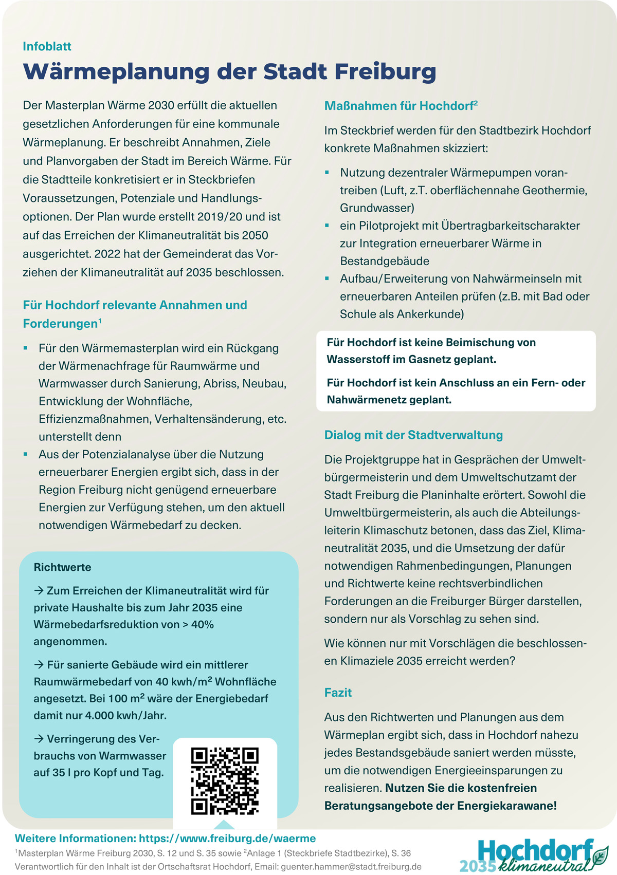 Damit die Betroffenen aus dem Beratungsangebot möglichst viel profitieren, möchte der Ortschaftsrat die Bürgerinnen und Bürger im Vorfeld gezielt zum Thema informieren. Im Blättle (Hochdorf aktuell) vom 16.2.2024 informieren wir über die Wärmeplanung der Stadt Freiburg und was diese für Hochdorf bedeutet.