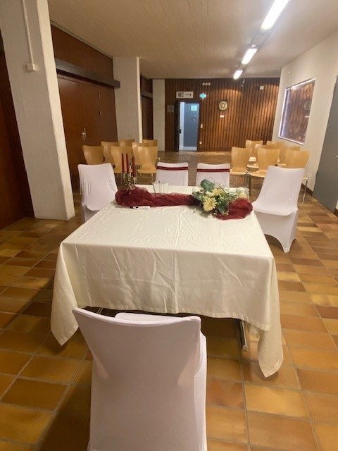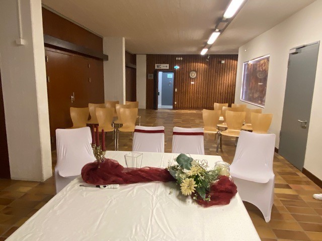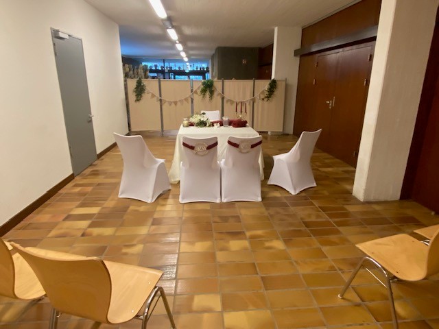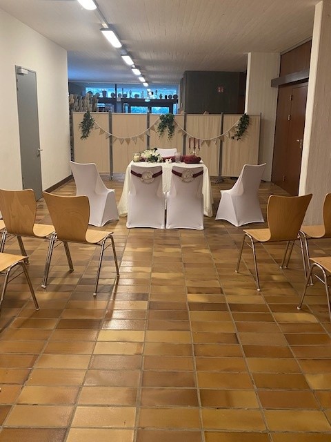 Durch den Neubau des Rathauses finden unser Trauungen aktuell im "Übergangsrathaus" in den Büros statt. Hier wird sozusagen aus zwei Büros ein Trauzimmer gemacht, was sich durchaus sehen lassen kann.