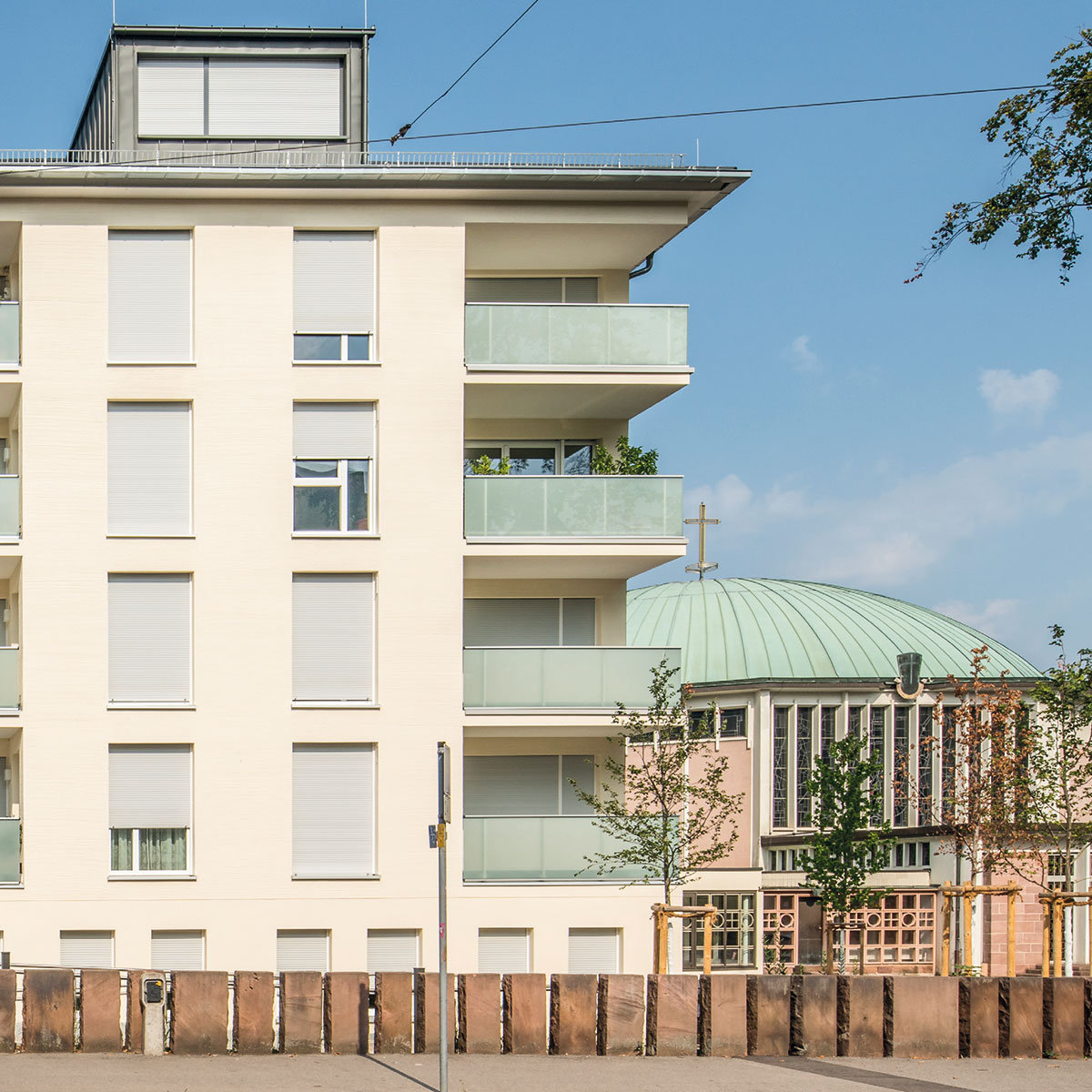 Barrierefreie Begegnungsräume für Jung und Alt sowie Wohnraum für ältere Ordensmitglieder – das waren die erklärten Ziele dieses Mehrgenerationenprojekts auf einem Grundstück neben der Mutterhauskirche in Freiburg. Dafür wollte man zunächst das alte St. Carolushaus abreißen, um dann auf dem Areal drei Neubauten zu realisieren.