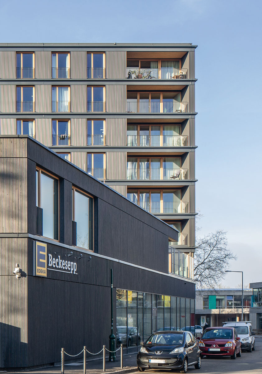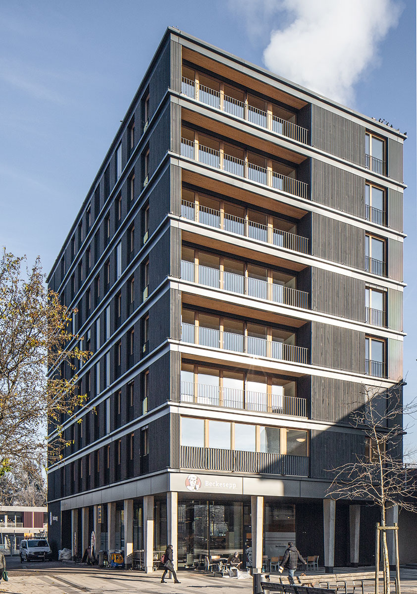 Bundesweit für Aufmerksamkeit sorgte das achtgeschossige Holzhaus besonders als erstes FSC® -zertifiziertes Gebäude in Deutschland. Doch die Herausforderungen bei der Entwicklung des 2021 fertiggestellten Baus lagen aus stadtplanerischer Sicht weniger aufseiten eines nachhaltigen Konzepts. Vielmehr galt es, den Neubau sinnvoll in die städtebauliche Situation zu integrieren. Diese ist in Weingarten geprägt durch eine für die 1960er Jahre typische Bebauung. Der große Sanierungsbedarf, die fehlende soziale Durchmischung des Stadtteils sowie erheblicher Wohnungsmangel waren bekannt. Bei Neu- und Umbauten in dieser Gegend galt es deshalb, insbesondere auf die Verbesserung der Nahversorgung, auf das Erschließen attraktiver Freiräume sowie auf vielfältige Wohnraumangebote zu achten.