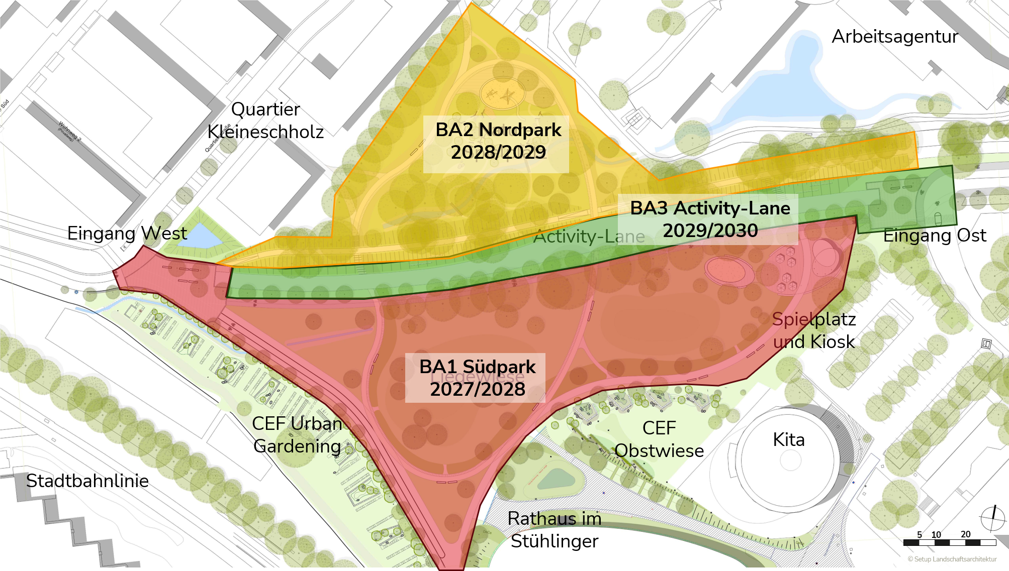 - In der ersten Jahreshälfte 2026 ist eine Beteiligung zur Gestaltung der beiden Spielplätze im Park vorgesehen.