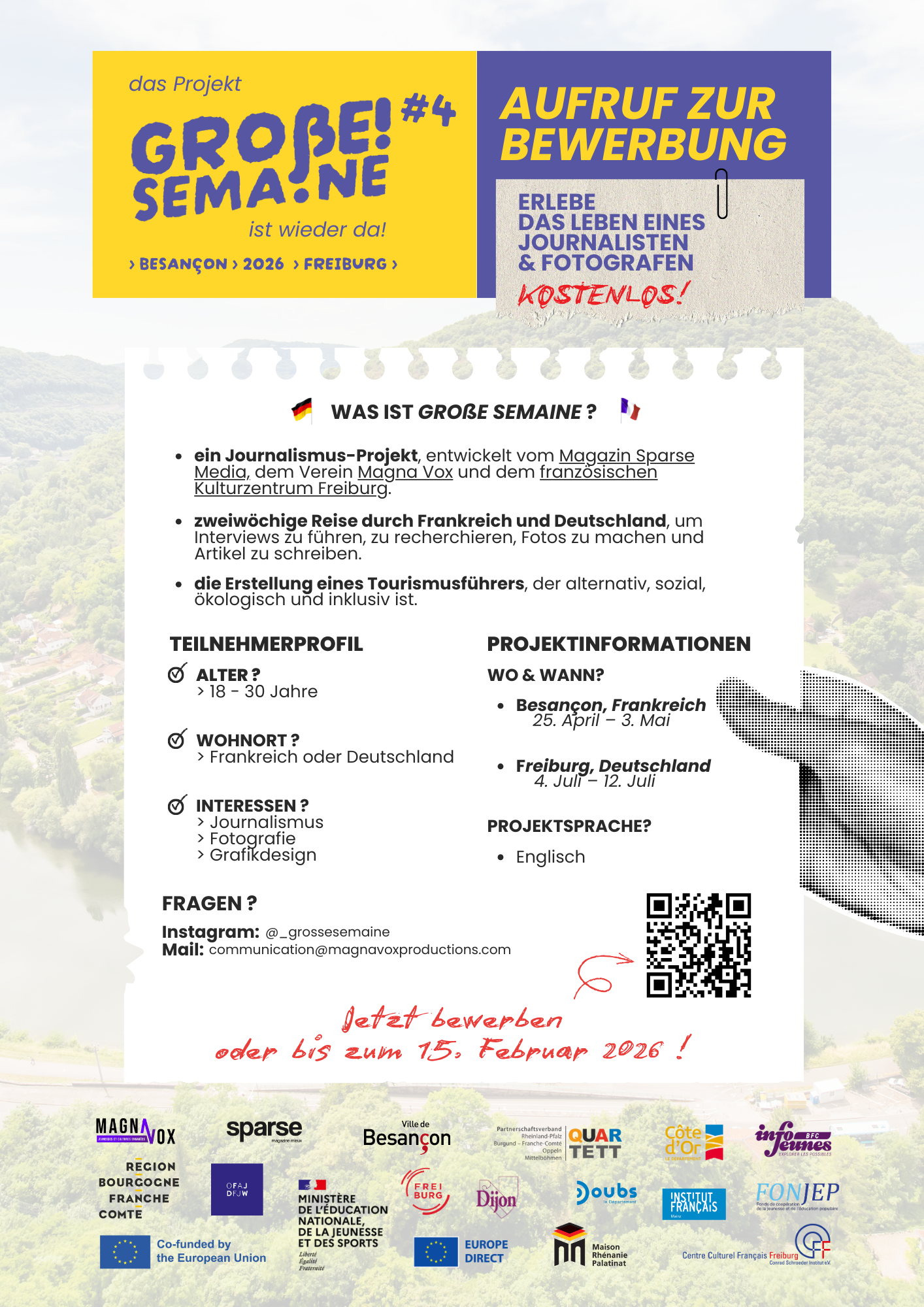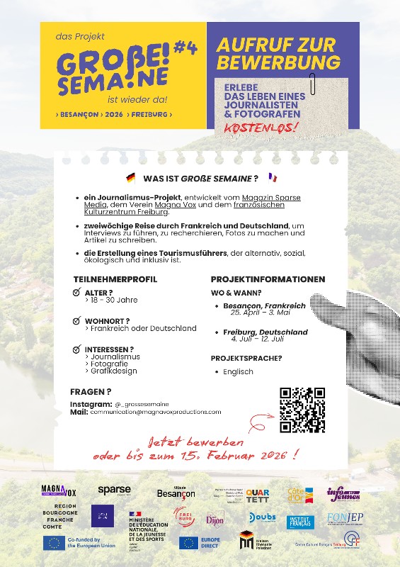 Der Verein Magna Vox und die Zeitschrift Sparse mit Sitz in Dijon organisieren 2026 die dritte Ausgabe des EU-geförderten deutsch-französischen Journalismus-Projekts "Große Semaine" - dieses Mal zwischen den Partnerstädten Freiburg und Besançon.