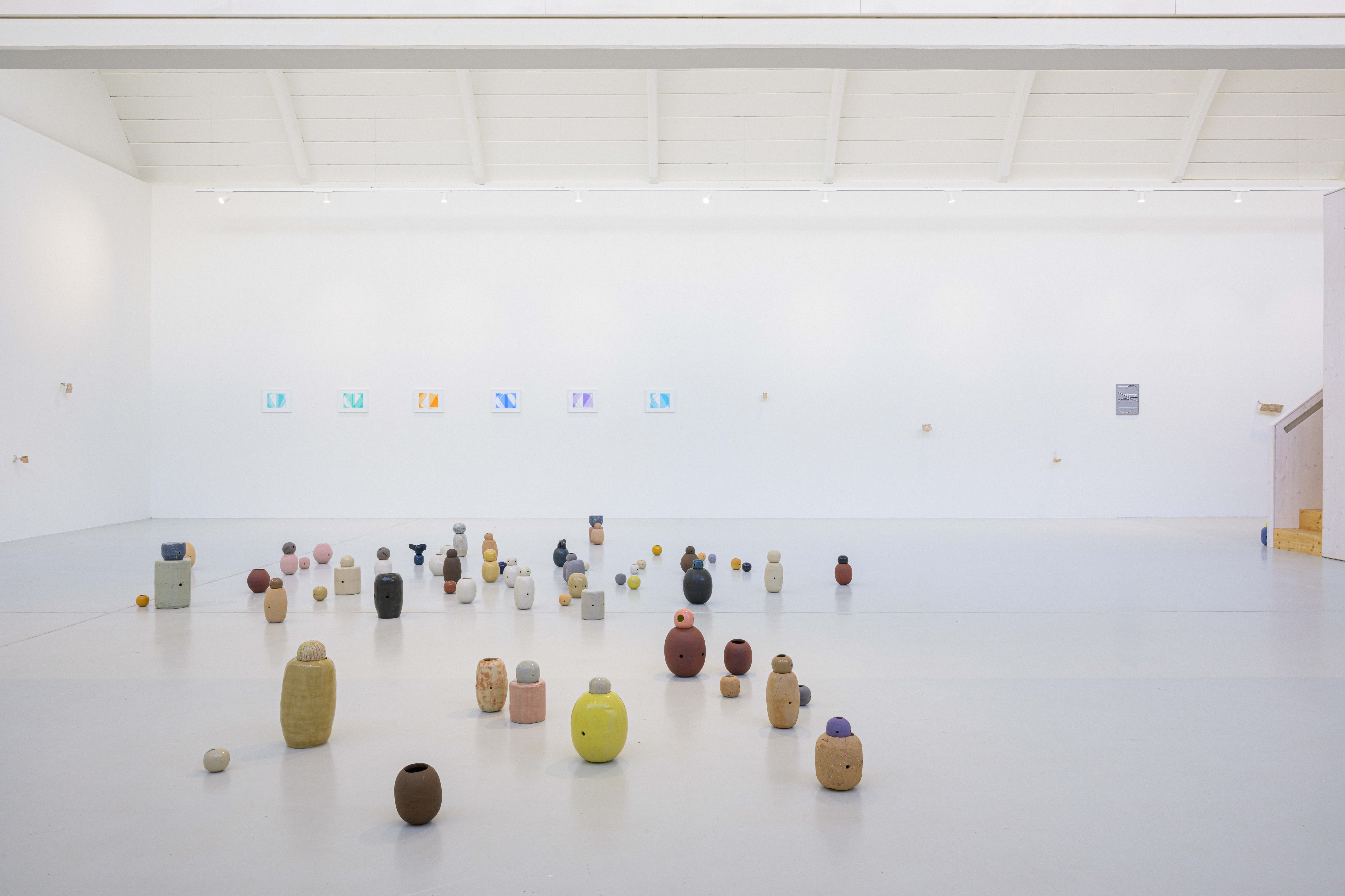 Bei Tim Bohlender wird das Wort zum Bild: Zeichen, Fragmente und typografische Setzungen lösen sich von ihrer ursprünglichen Funktion und werden zum Anlass für Malerei. Nozomi Tanabe greift das gesprochene Wort aus einer anderen Richtung auf – ihre seriellen Holzreliefs zeigen Gesichter und Lippen als Orte von Sprache, als körperliche Schnittstellen zwischen Innen und Außen, Kommunikation und Schweigen. Tanja Goetzmanns keramische „Geister“ wiederum erscheinen als Hüllen, wesenhaft, als Spuren von Präsenz und Abwesenheit. Auch sie sprechen, jedoch über Oberfläche, Farbigkeit und Materialität.