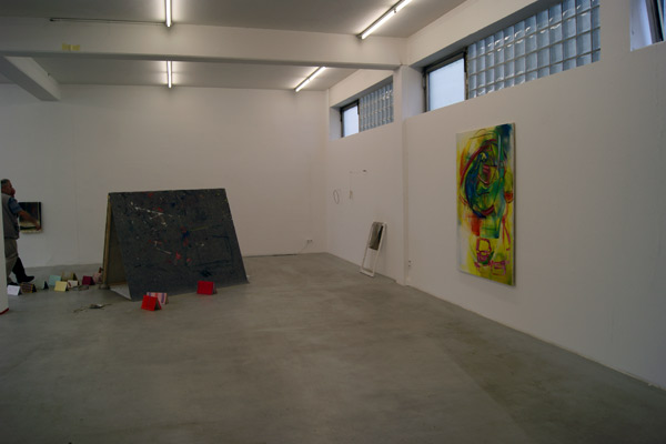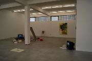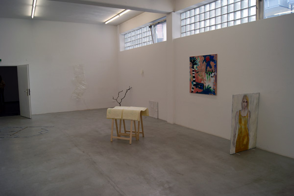 Franziska Döser setzt sich mit der beengten Ateliersituation auseinander. So zeigt sie eine zuerst abgeschmirgelte, dann gebügelte und zum Schluss gefaltete große Leinwand, welche die Produktionsbedingungen ihres Ateliers reflektiert. Zum einen entsteht durch die Enge etwas Produktives in der Entwicklung neuer Methoden, zum anderen ist sie in der möglichen Größe ihrer Leinwände stark eingeschränkt.