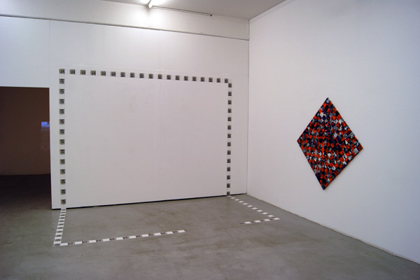 Als Auseinandersetzung mit Ihrem Atelierraum zeigt Annette Raess-Kuechlin die Vervielfältigung einer Zeichnung, die sie von Georgia O`Keeffe gemacht hat. Im Wechsel von Vorder- und Rückseite der Postkarte zeichnet sie die Ausmaße ihres Atelierraums auf Wand und Boden nach. Wie in ihren gewebten Gemälden wechselt sich Sichtbares und Verborgenes ab.
