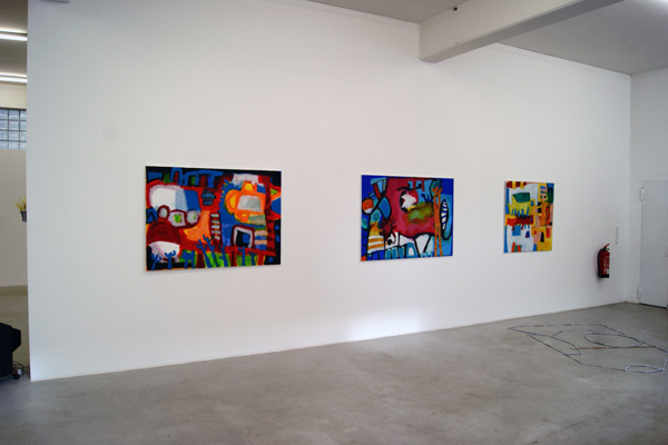 Hanne Botschs farbintensive Malereien hingegen lassen kaum eine Bedrohung spüren. Die nahezu gleichberechtigt eingesetzten Farben deuten Figuratives an, ohne sich drauf zu verstetigen. Vielmehr schwanken die Gemälde zwischen dem abstrakt Angedeuteten und einer emotionsgeladenen, strukturierten Unordnung. Auffallend ist die zur Zweidimensionalität hinstrebenden Wirkung. Hier spürt man die Faszination von Hanne Botsch für Stadtpläne und Landkarten. Das Umkippen der Perspektive auf etwas Planes von oben Betrachtetes.