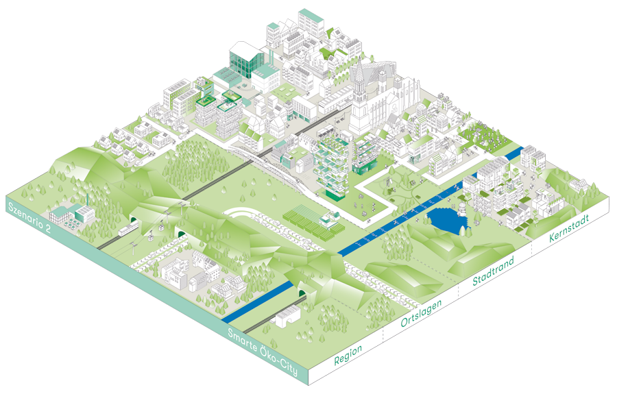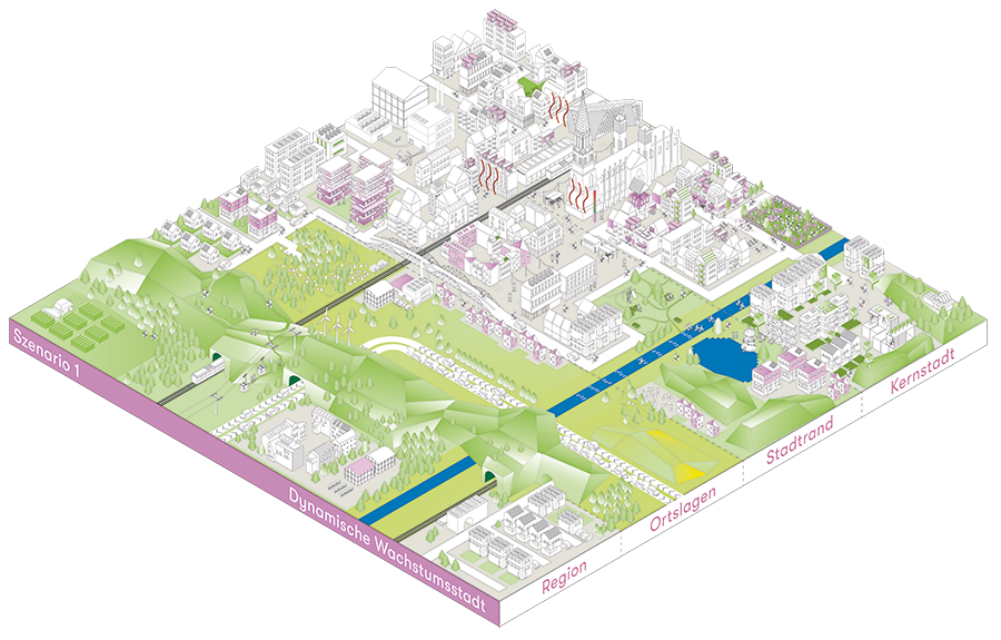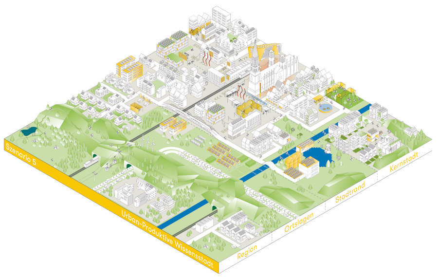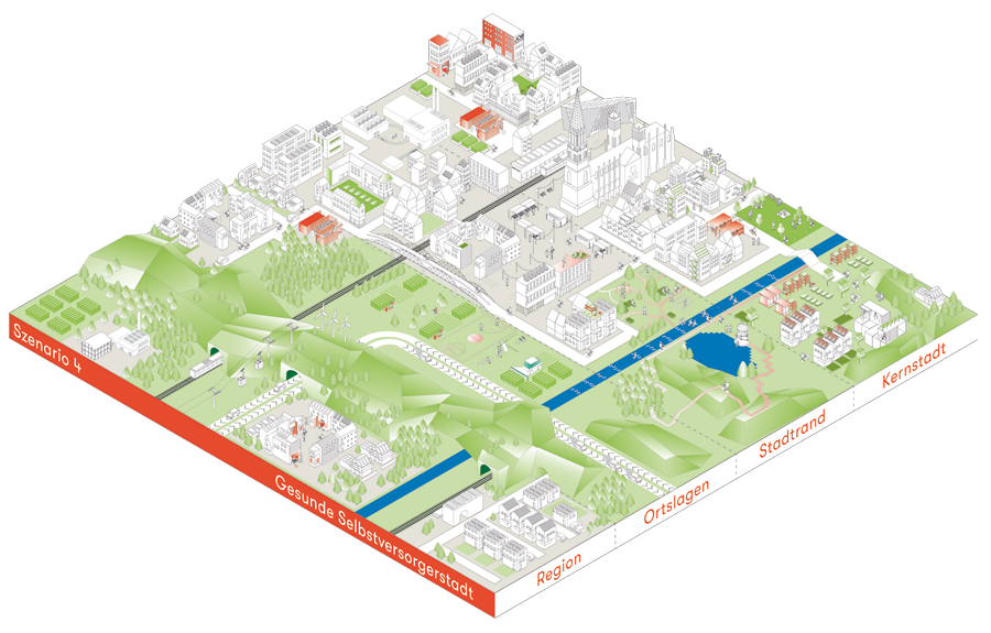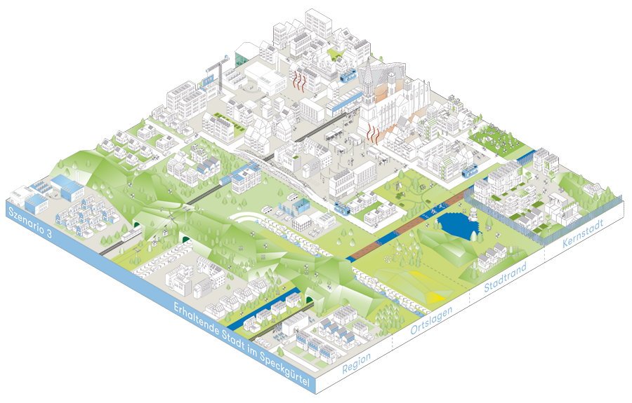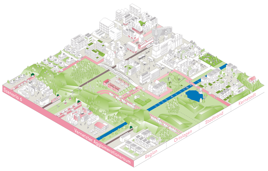 2. In diesem Szenario rücken Wohnen, Arbeiten und Freizeit näher aneinander. In der Kernstadt verschwinden die großen Einzelhandelsflächen und es entstehen bunt gemischte Räume, wo Cafés und Wohnungen ebenso zu finden sind wie Büros, Läden oder Kindertagesstätten. Das Preisniveau ist extrem hoch und liegt deutlich über dem in den Ortslagen. Würden Sie sich trotzdem gerne in dieser Innenstadt aufhalten?