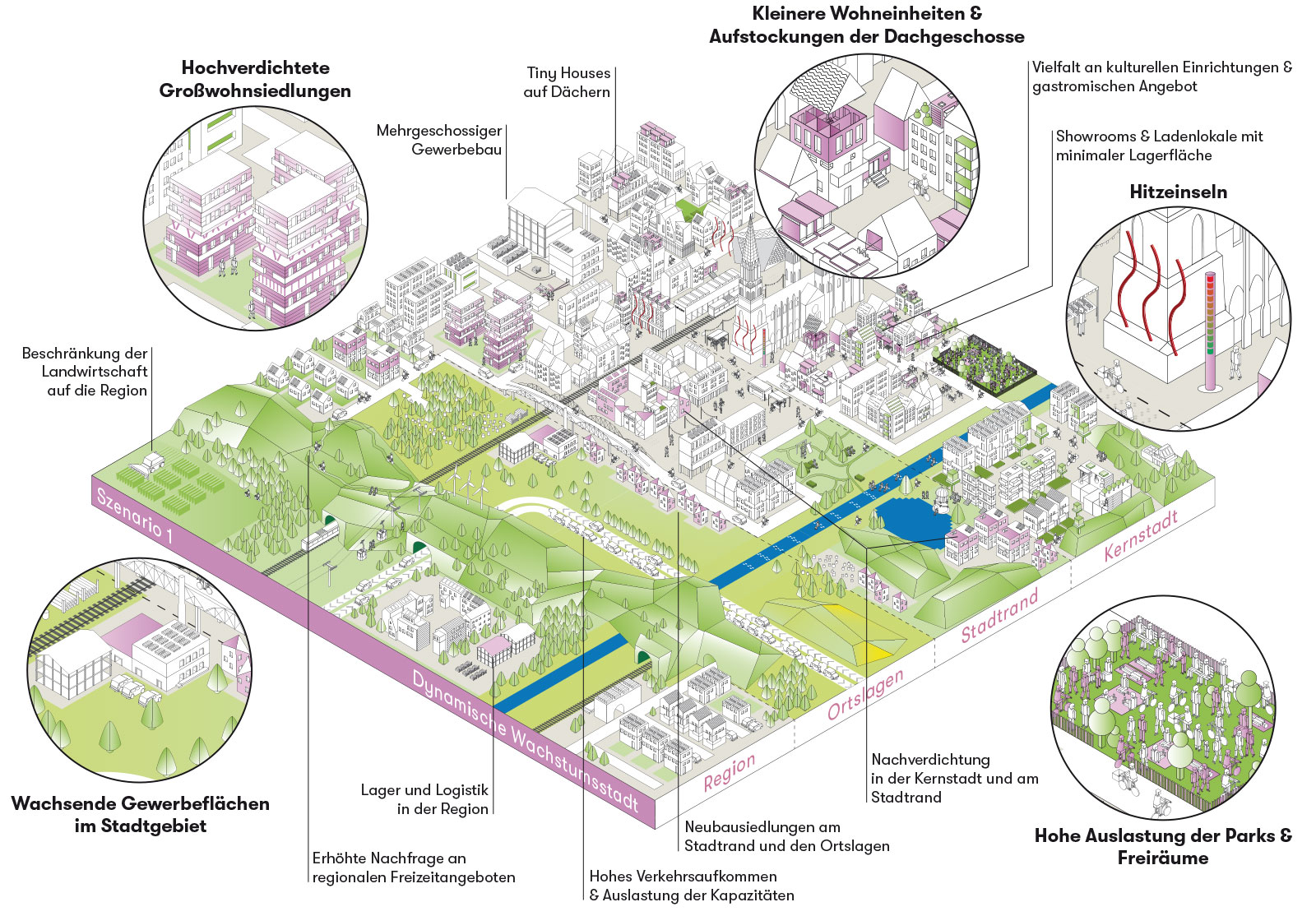 Zur Verdichtung am Stadtrand und in den Ortslagen wurden alle Möglichkeiten erschlossen bzw. genutzt: So entstanden Anbauten und „Tinyhouses“ auf Dächern, in Gärten und Höfen des Bestands.