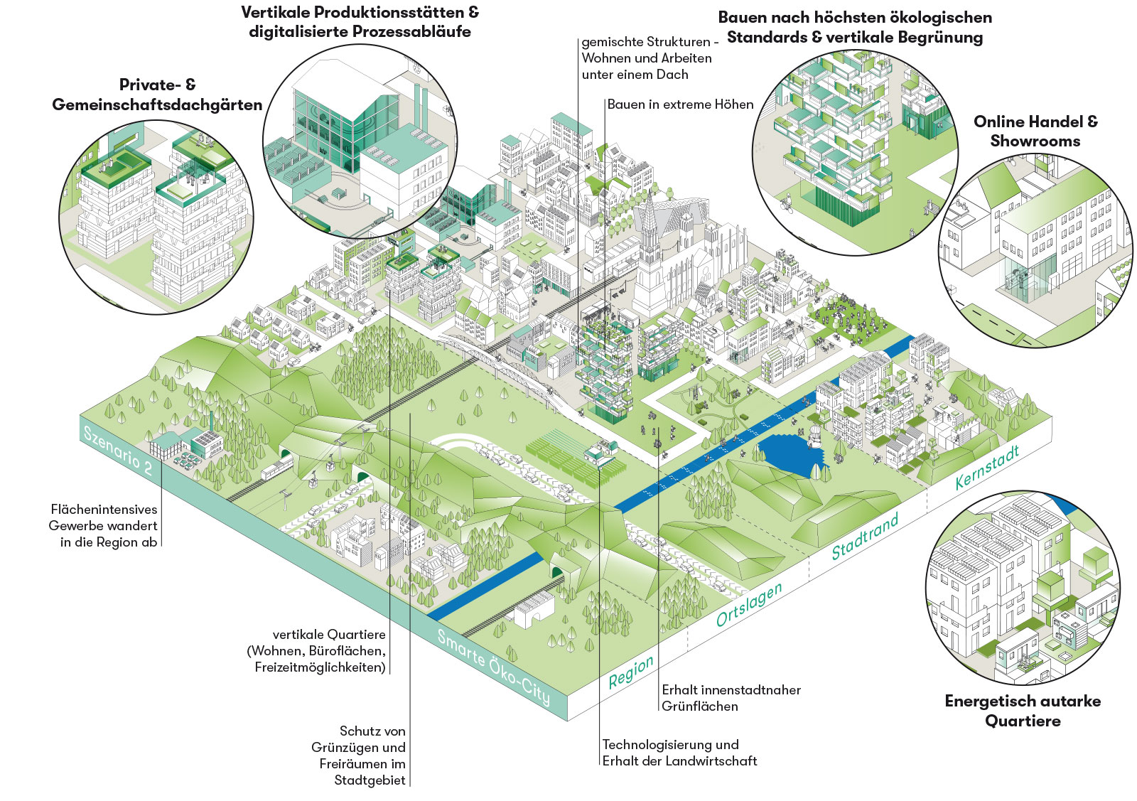 Nach und nach wurden besonders flächenintensive und weniger wertschöpfungsintensive Gewerbe (z.B. Logistik) in die Ortslagen bzw. in die Region verdrängt. Und mit ihnen auch die entsprechenden Arbeitsplätze, die bis dahin zu einer insgesamt guten sozialen Stabilität beigetragen hatten. In den „vertikalen Quartieren“ entstand eine programmatische Vielfalt: verschiedenste Einrichtungen finden sich unter einem Dach und bilden fast eine Art eigene „Stadt in der Stadt“. Hier ist die Nutzungsmischung sehr hoch, insbesondere Dienstleistungen haben dort feste und flexible Standorte gefunden. Räume werden zu verschiedenen Zeiten in verschiedenen Funktionen genutzt (Multicodierung).