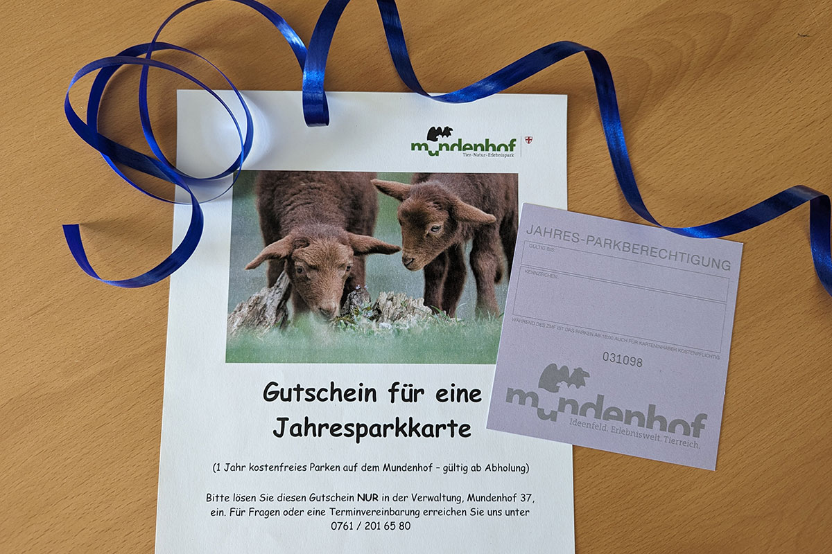Sie möchten eine Jahresparkkarte verschenken? In der Mundenhof-Verwaltung können Sie gegen 60 Euro in bar einen Gutschein für eine Jahresparkkarte erwerben. Der / die Beschenkte bestimmt den Geltungszeitraum und kann den Gutschein (nur bei uns in der Verwaltung) zum gewünschten Zeitraum gegen die Jahresparkkarte einlösen.