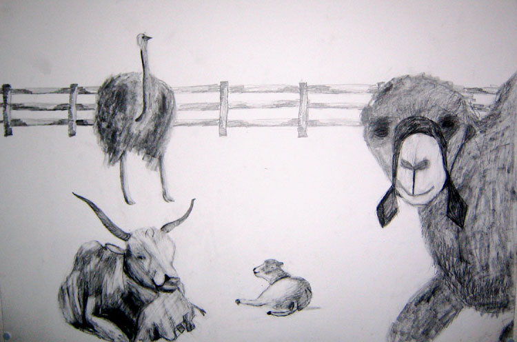 Friedliches Miteinander von Kamel, Rind und Pfau