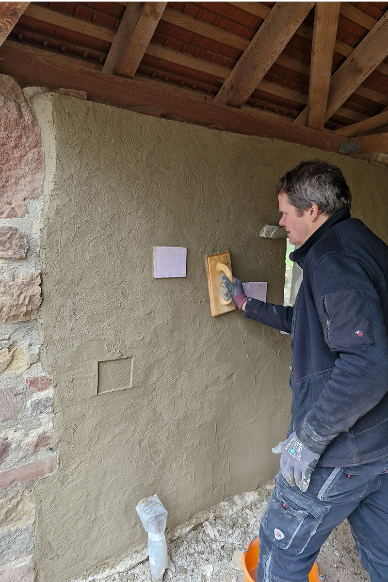 In präziser Handarbeit kamen die Fußabrücke schließlich an die Wand. Mithilfe der Gips-Stempel wurden die Spuren in den frischen Putz modelliert, passend zu all den spannenden Klappen, Federn und Eiern, die es an der Wand noch zu entdecken gibt.