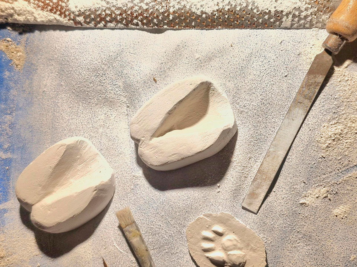Den nächsten Schritt kennt man aus klassischen Krimis. Die Abdrücke haben wir mit Gips ausgegossen und trocknen lassen. Danach war Fleißarbeit gefragt: Die Gipsabdrücke mussten geputzt und geschliffen, vervielfältigt und lackiert werden, bis schließlich genaue Tierspuren-Stempel entstanden.
