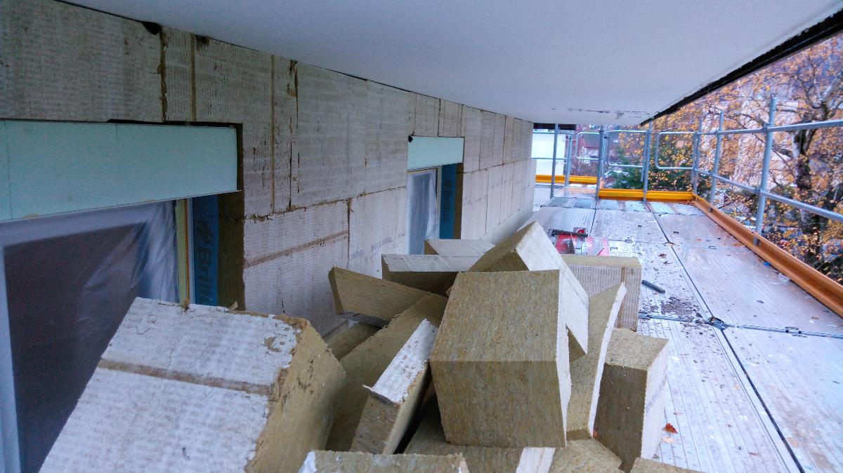 20 cm Mineralwolle (WLG 035), 20 cm Schaumglas als Perimeterdämmung (WLS 042), 5 cm Vakuumdämmung bei Balkonwänden, um wenig Balkonfläche zu verlieren (WLS 005) U-Wert zwischen 0,15 und 0,09